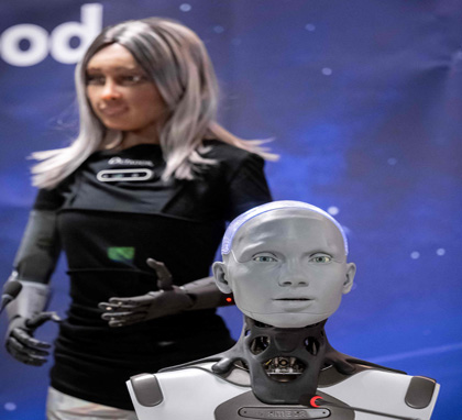 ¡Qué tensión en este silencio!, dijo uno de los robots antes del inicio de la conferencia de prensa convocada por la ONU al término de la Cumbre Mundial sobre IA para el Bien Social, en la que participaron más de 3 mil personas, quienes interactuaron con algunas de las máquinas más avanzadas del planeta. Dirigentes y representantes de empresas debatieron jueves y viernes sobre la necesidad de elaborar normas que garanticen que estas innovaciones se utilicen con fines positivos para la humanidad, como la lucha contra el hambre o el cambio climático. En la imagen, los androides Mika y Ameca. Foto Afp
