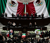 Sobre el féretro de Porfirio Muñoz Ledo, al pie de la tribuna, fue colocada una bandera nacional. Foto Luis Castillo