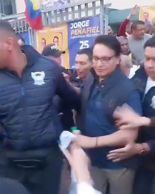 ▲ El candidato presidencial Fernando Villavicencio, segundos antes de subir a su camioneta, donde fue tiroteado al terminar un mitin en Quito, a poco más de una semana de las elecciones, en las que era el segundo favorito. En días pasados el periodista de 57 años denunció amenazas de muerte de Fito, identificado como capo de un grupo ligado al cártel de Sinaloa. Guillermo Lasso decretó 60 días de estado de excepción. Foto tomada de la red social X / Agencias