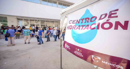 ▲ La ola cálida que azota Baja California ha dejado hasta el momento 42 fallecidos, según cifras del sector salud estatal. El martes pasado el termómetro rompió el récord histórico con 51.4 grados, en medio de la inconformidad de ciudadanos por los constantes cortes en la electricidad, debido a la sobrecarga por el uso excesivo de aparatos de aire acondicionado. En la imagen, centro de hidratación instalado por las autoridades para asistir sobre todo a personas en situación de calle y migrantes. Foto La Jornada. Antonio Heras