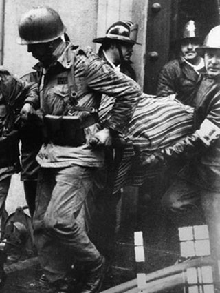 ▲ Soldados y bomberos sacan del Palacio de La Moneda el cuerpo del presidente Salvador Allende, el 11 de septiembre de 1973. Mientras era atacado, el mandatario instaba por radio a obreros y estudiantes a defender al gobierno. Foto Ap