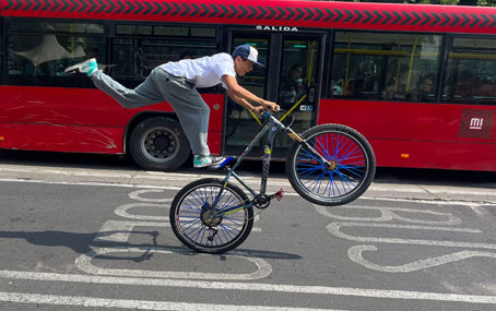▲ Integrante de la agrupación de ciclistas Tribu Stun realiza acrobacias en las inmediaciones del Metro Hidalgo. Foto Pablo Ramos
