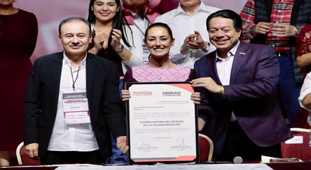 ▲ La ex funcionaria capitalina recibió ayer la constancia que la acredita como la coordinadora de los comités de defensa de la Cuarta Transformación, y virtual candidata presidencial, por parte del Consejo Nacional de Morena. Planteó a la militancia cinco tareas, entre ellas la de fortalecer la organización que se hace desde abajo, casa por casa. También, consolidar el programa partidista, difundir los logros gubernamentales y asumir las tareas de unidad. Foto Luis Castillo. Georgina Saldierna y Néstor Jiménez