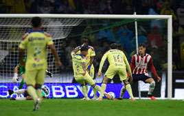 ◀ En la octava fecha de la Liga Mx, las Águilas doblegaron al Guadalajara en el clásico nacional. Brian Rodríguez (número 7 en la imagen) abrió el marcador, Diego Valdés anotó un doblete y Alejandro Zendejas cerró la cuenta ayer en el estadio Azteca. El Rebaño sólo tuvo contados remates a portería. Foto Afp