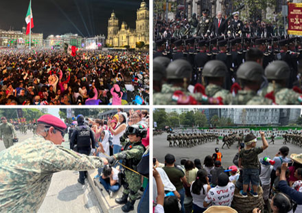 ▲ Arriba a la izquierda, panorámica del Zócalo la noche del viernes. Ayer, el Colegio Militar fue el protagonista del desfile del 213 aniversario del inicio del movimiento de Independencia, en el que participaron más de 18 mil efectivos y delegaciones de 19 países. La última imagen, frente a la glorieta de los desaparecidos. Fotos Yazmín Ortega, José Antonio López y Marco Peláez