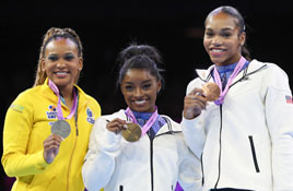 ◀ Después de dos años de ausentarse del deporte por la crisis que padeció en las Olimpiadas de Tokio, la gimnasta estadunidense ganó oro en el all around de Amberes, donde debutó hace 10 años, cuando tenía 16. En la imagen, con la brasileña Rebeca Andrade (izquierda) y su compatriota Shilese Jones. Foto Ap