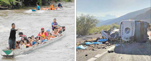 ▲ Los presidentes de Panamá y Costa Rica respaldaron el llamado de su par mexicano de realizar una cumbre regional urgente de países afectados por flujo migratorio, luego de hacer un recorrido aéreo por las comunidades de la zona fronteriza con Colombia, en la selva del Darién (izquierda), en el que constataron la situación de las personas que llegan de manera irregular, en medio de grandes peligros. El Instituto Nacional de Migración informó que del 18 de septiembre al pasado día 3, más de 27 mil personas han sido convencidas de bajar de techos y contenedores de las rutas de Ferromex, y en lo que va del año identificó en diversos puntos de control del país a un millón 566 mil 948 indocumentados, de los cuales 138 mil son menores de edad. Asimismo, dio a conocer que reforzó gestiones para que Venezuela, Brasil, Colombia, Cuba y Nicaragua acepten a sus connacionales repatriados. A la derecha, escena del accidente de ayer en los límites de Oaxaca y Puebla, donde volcó un autobús de la empresa Xoxo, con 55 indocumentados a bordo. Fotos Afp