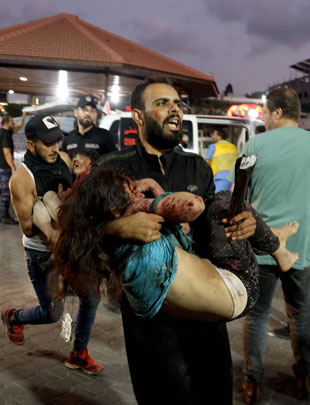 ▲ Transporte de dos menores palestinas heridas al hospital Al-Shifa, el principal de Gaza, por los intensos bombardeos israelíes. El nosocomio sólo dispone de combustible para mantener el suministro eléctrico durante tres días, se reportó. El asedio de Tel Aviv impide, desde el domingo, que lleguen alimentos, agua, medicamentos y energía a la ciudad devastada. Foto Afp