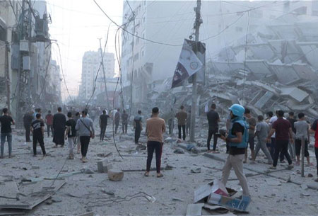 ▲ Destrucción por doquier se observa en las calles de la ciudad de Gaza por los devastadores bombardeos de Israel tras la agresión del grupo islamita Hamas. Las fuerzas de Tel Aviv atacaron ayer el campamento de refugiados de Jabaliya y derribaron un edificio repleto de familias, lo que dejó al menos 45 decesos. en el sexto día del conflicto, el saldo es de mil 300 israelíes muertos y mil 537 del lado palestino, entre ellos 500 niños y 248 mujeres. Foto divulgada por la Organización de naciones Unida