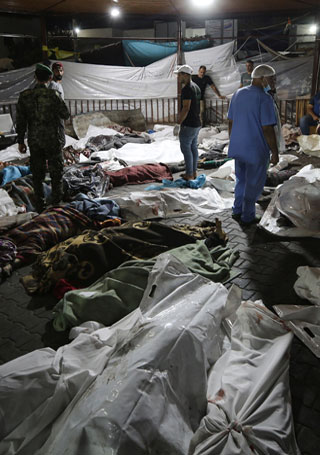 ▲ Decenas de cadáveres de palestinos que murieron en el ataque al hospital Al-Ahli de Gaza fueron colocados en las afueras del nosocomio. en videos se escucha el silbido de un proyectil antes de estrellarse. otras imágenes muestran los instantes posteriores en los que personas aturdidas se abren paso entre los restos de cientos de cuerpos de adultos y niños que yacían en el suelo. Foto Ap