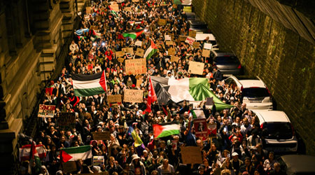 ▲ Movilización en Lausana, suiza, para que se ponga freno a los bombardeos sobre la población palestina en la franja de Gaza. Foto Ap