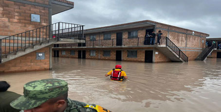 ▲ Integrantes del Ejército y de la Guardia Nacional rescataron a afectados por las inundaciones en Villa Juárez (imagen), municipio de Navolato, tras el paso del meteoro, el cual provocó el desbordamiento de canales y arroyos, que anegaron Ahome, Angostura y Culiacán. Norma provocará