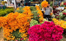◀ En manojos o en maceta se ofrece la tradicional flor de cempasúchil en el mercado de Jamaica. Empleados de la Profeco realizan recorridos en centros de abasto para verificar que los precios de los productos para las ofrendas no se disparen. Foto Luis Castillo