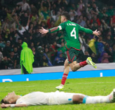 ▲ Edson Álvarez celebra el gol que dio el empate a 2 global a la selección ante la escuadra de Honduras, a segundos del final. Se fueron a tiempos extras y luego en penales se consiguió el triunfo por 4-2 con el que el Tri obtuvo el pase directo a la Copa América. La victoria hizo que los silbidos de descontento iniciales quedaran en el olvido. Foto Luis Castillo. Alberto Aceves