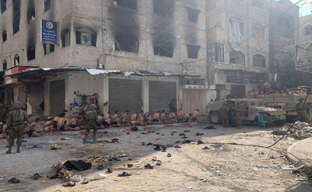 ▲ Cadenas de televisión de Israel difundieron ayer videos que muestran a decenas de palestinos semidesnudos, de rodillas, con los ojos vendados y bajo custodia en la franja de Gaza, lo que desató el repudio en redes sociales. Entre los aprehendidos se reconoció a Diaa Al- Kahlout, reportero de The New Arab, así como al director de una escuela y un empleado de la ONU. También se informó que un bombardeo mató a 22 integrantes de la familia del corresponsal de Al Jazeera, Moamen Al Sharafi , en el campo de refugiados de Jabaliya. Organizaciones advirtieron que la crisis de hambre se agudiza en el territorio invadido. Foto tomada de la red X. The Independent y Agencias
