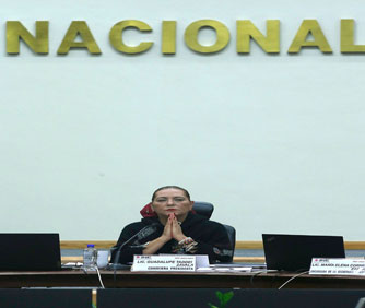 ▲ Luego de 13 horas de debate, las posiciones irreductibles de los integrantes del Consejo General del instituto impidieron anoche alcanzar acuerdos. La sesión debió suspenderse por falta de quorum, luego de que los representantes de cuatro partidos y tres consejeros se retiraron de la mesa. Desde que llegó al cargo, en abril pasado, Guadalupe Taddei, titular del organismo (en la imagen durante la reunión de ayer), no ha logrado concretar sus propuestas para varias direcciones y la Secretaría Ejecutiva. Foto José Antonio López. Fabiola Martínez