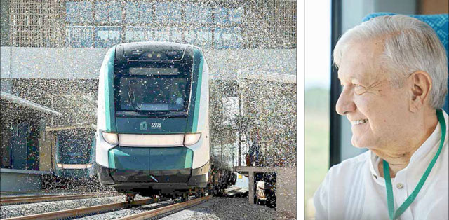 ▲ En el primer viaje del Tren Maya, el asiento P fue ocupado por el pasajero Andrés Manuel López Obrador, quien sonriente, ayer vio concretado uno de sus sueños más anhelados. Develó la placa conmemorativa que representa el arranque de la nueva era ferroviaria en el país, que potenciará una región de amplios contrastes, con grandes polos de desarrollo y un sinnúmero de comunidades en condiciones precarias. Acompañaron al Presidente el empresario Carlos Slim y los secretarios de Marina, Rafael Ojeda, y de la Sedena, Luis Cresencio Sandoval. El Jaguar Rodante se abrió paso entre una cascada de confeti brillante. Fotos Presidencia