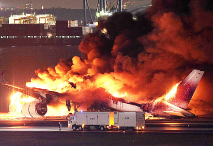 ▲ Las cinco víctimas iban en una aeronave de la guardia costera que chocó ayer en la pista de la terminal de Tokio Haneda con un aparato comercial que acababa de aterrizar, cuyos 379 pasajeros y 12 tripulantes pudieron ser evacuados. Por el momento no podemos explicar la causa del accidente, informó el ministro de Transporte. Mientras, rescatistas trabajan contra reloj, bajo un clima gélido y varias complicaciones, en busca de sobrevivientes del terremoto magnitud 7.6 que sacudió al país asiático en el primer día del año, con saldo de al menos 62 decesos, 300 heridos y múltiples daños. Foto Afp / Afp, Reuters, Ap y Sputnik