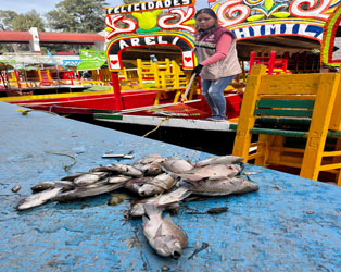 ▲ Remeros y personal de vigilancia ambiental de la alcaldía Xochimilco recolectaron alrededor de 500 carpas, mojarras y tilapias que flotaban en los canales del paradero Zacapa, pueblo de Nativitas, que murieron por la contaminación del agua debido a una falla en la planta de tratamiento de Sacmex. Foto Luis Castillo.