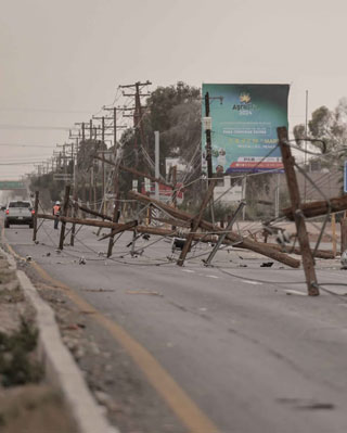 ▲ Ventarrones de 75 kilómetros por hora, generados por el frente frío 26, derribaron 11 postes de energía eléctrica en la carretera Mexicali-San Felipe. Los cables se enredaron en un autobús con 30 pasajeros, quienes fueron rescatados por bomberos. En Chihuahua, dos tráileres volcaron por los fuertes vientos en la vía que va hacia Ciudad Juárez, al igual que un camión en un tramo que lleva a Ciudad Cuauhtémoc. Varios caminos fueron cerrados por el temporal. Foto La Jornada Baja California. / Corresponsales