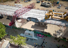 ◀ El brazo de una grúa de la empresa italiana Rizzani de Eccher se dobló al colocar una dovela de 90 toneladas en el Viaducto que pasa por la Alcaldía Álvaro obregón. Dos vehículos estacionados fueron aplastados. no hubo heridos. Foto José García.