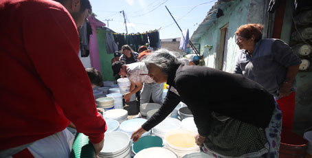 ▲ Vecinos de la colonia Santa Inés, en Azcapotzalco, bloquearon por varias horas la avenida 16 de Septiembre para exigir el abastecimiento a la unidad habitacional Esperanza 61 y el tandeo en otras casas y vecindades (en la imagen); las autoridades enviaron pipas. Asimismo, en la unidad Torres de Chimalistac, colonia Copilco Universidad, en Coyoacán, llevan varios días sin suministro; han tenido que recurrir a pagar a empresas privadas porque no ha llegado el servicio gratuito solicitado. Foto Yazmín Ortega Cortés. Ángel Bolaños