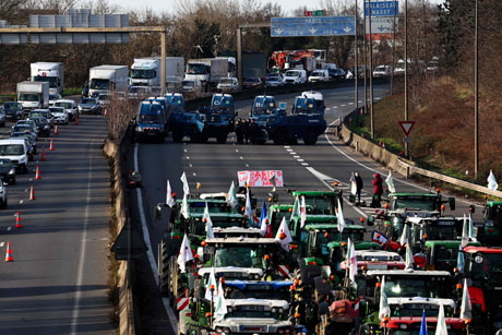 ▲ Ante las movilizaciones, la Comisión Europea anunció planes para protegerlos de importaciones baratas y permitir que utilicen terrenos en desuso por cuestiones ambientales. Los inconformes han alzado la voz contra el aumento en los costos de producción, los impuestos y las regulaciones excesivas. El presidente de Francia, Emmanuel Macron, señaló que quiere congelar un acuerdo de libre comercio con países sudamericanos ante la oposición de agricultores. En la imagen, bloqueo de una vía en las afueras de París. Foto Afp. / Agencias