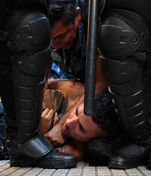 ▲ Un desmedido operativo de seguridad se desplegó en Buenos Aires contra manifestantes que rechazaban, frente al Congreso, el intento del gobierno de Javier Milei de imponer la aprobación del decreto de necesidad y urgencia y la Ley Ómnibus. La protesta era pacífica, pero los agentes empujaron con violencia a varios participantes y los golpearon con bastones. En el Legislativo el debate fue candente y los textos no avanzaron hacia un dictamen, por lo que se decretó un receso para continuar hoy. Foto Afp. / Stella Calloni, corresponsal