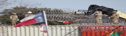 ▲ En vísperas de que el gobernador Greg Abbott realice visitas a la frontera con México, legisladores demócratas y defensores de los derechos de migrantes advirtieron que grupos ultraderechistas se han movilizado para mostrar su apoyo al mandatario. En la imagen, militares refuerzan la alambrada de púas en Eagle Pass. Foto Cuartoscuro. Jim Cason y David Brooks