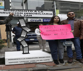 ▲ Residentes de la alcaldía Benito Juárez colocaron la obra en la avenida Insurgentes Sur 1774, frente a un edificio en el que los ex funcionarios panistas Nicias Aridjis y Luis Vizcaíno cometieron una serie de ilícitos como parte del llamado cártel inmobiliario. El inmueble fue entregado a la fi scalía capitalina. Foto Jorge Pablo García. Elba Mónica Bravo
