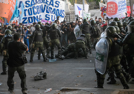 ▲ integrantes de la gendarmería argentina golpean a manifestantes en las afueras del Congreso, en buenos Aires, donde se debaten las reformas antipopulares del presidente ultraderechista Javier Milei. Al igual que el pasado miércoles, la ministra de seguridad, Patricia Bullrich, ordenó un desproporcionado y violento operativo contra opositores. La cifra de detenidos aún se desconoce. Foto Afp