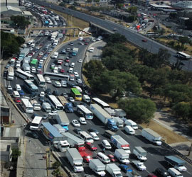 ▲ Con la participación de sólo una organización del gremio, transportistas de carga y de pasajeros se movilizaron en las principales vías de acceso a la CDMX, así como en arterias de 19 estados, para demandar mayor seguridad y poner un alto a robos, extorsiones, secuestros y asesinatos. La imagen, en Ecatepec. Foto Cuartoscuro.