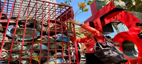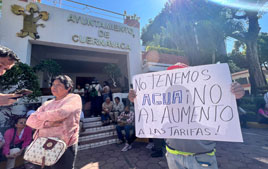 ◀ La Asociación Cívica Morelense protestó ante el ayuntamiento local por el alza desmedida en el cobro del líquido. En León, Guanajuato, el suministro está en punto crítico debido a que la presa El Palote, su fuente de abastecimiento, se halla a 6 por ciento de su capacidad. Foto Rubicela Morelos.