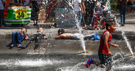 ▲ En las postrimerías del invierno, que concluye en 10 días, Guerrero, Campeche, Yucatán, Michoacán, Veracruz y Morelos registraron temperaturas de entre 40 y 45 grados, mientras 21 entidades superaron los 30 grados, de acuerdo con la Comisión Nacional del Agua (Conagua). La ola de calor en algunas zonas de la Ciudad de México rebasó los 32 grados, casi dos menos que la más alta reportada en la capital, de 33.9, el 9 de mayo de 1998. Asimismo, la sequía afecta a más de 60 por ciento del territorio nacional. En la imagen, las fuentes de la Alameda Central. Foto Víctor Camacho / Alejandro Cruz Flores y Redacción
