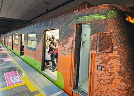 ▲ Agua, lodo y materiales de construcción cayeron ayer a las 11:35 horas sobre un convoy que salió de la estación Eje Central hacia Parque de los Venados, debido a los trabajos de perforación en un inmueble de departamentos que se edifica en la avenida División del Norte 2228. Autoridades señalaron que la alcaldía Benito Juárez autorizó de manera irregular permisos a la firma desarrolladora. Martí Batres, jefe de Gobierno, afirmó que el incidente es efecto del cártel inmobiliario. Foto Metrovisión./ R. González y B. Ramírez