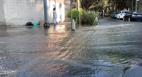 ▲ Una fuga de agua en la colonia Portales de la capital del país, entre las calles de Nevado y Monrovia, que se detectó a las 8 de la mañana, provocó un severo encharcamiento que dejó atrapados a decenas de vecinos. Al lugar acudió personal de la brigada del Sistema de Aguas de la Ciudad de México (Sacmex) para cerrar las válvulas de suministro, drenar el líquido y reparar la tubería. Según reporte de los habitantes de la colonia se trató del tercer incidente en lo que va del año. Foto Alfredo Domínguez