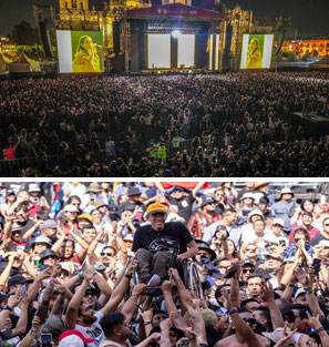 ◀▲ Julieta Venegas aportó su talento a Tiempo de mujeres: festival por la igualdad, en el Zócalo (imagen de arriba a la izquierda), donde expresó su solidaridad con la causa de colectivos de madres y padres de desaparecidos. Mientras, el Vive Latino (izquierda abajo) comenzó ayer con la asistencia de 80 mil personas en el Autódromo Hermanos Rodríguez para las presentaciones de Billy Idol, Fito Páez, Jorge Drexler y Bratty, entre otros. En tanto, en la Facultad de Música de la UNAM debutó el Mariachi Universitario de México (sobre estas líneas). Fotos Ocesa y Pablo Ramos