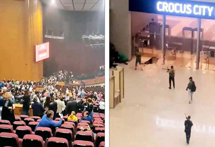 ▲ Un grupo de hombres armados y vestidos con uniformes de camuflaje abrió fuego de manera indiscriminada en la exclusiva sala de conciertos Crocus City Hall, donde el público aguardaba el inicio de la presentación del grupo de rock Piknik de San Petersburgo. El edificio también alberga supermercados, tiendas de lujo, cines y restaurantes, pero la agresión se centró ahí. Luego, el techo del recinto acabó por derrumbarse debido a un incendio. Unas cien personas lograron refugiarse en el sótano. Imágenes tomadas de videos