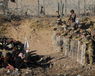 ▲ Venezolanos ondean una bandera blanca mientras son obligados a retirarse por miembros antidisturbios de la Guardia Nacional de Texas y la policía de carreteras que vigilan las orillas del río Bravo para impedir la llegada de más migrantes a Estados Unidos, como se observa desde Ciudad Juárez. Foto Afp
