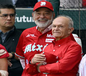 Carlos Slim y Alfredo Harp Helú, dueño de los Diablos Rojos del México, durante el juego de exhibición. Foto Afp