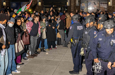 ▲ Estudiantes encaran a la policía luego de que algunos compañeros fueron detenidos y su campamento desalojado en el campus de la Universidad de Nueva York. Las movilizaciones de alumnos y académicos contra el bombardeo de Israel en la franja de Gaza se han incrementado en Estados Unidos. El PEN América anunció la cancelación de la ceremonia de entrega de premios literarios ante la retirada de más de un tercio de nominados, quienes mostraron su rechazo al genocidio de palestinos. La Unrwa señaló que Tel Aviv no ha mostrado evidencias de implicación de su personal con Hamas. Foto Afp. Jim Cason, David Brooks y Agencias
