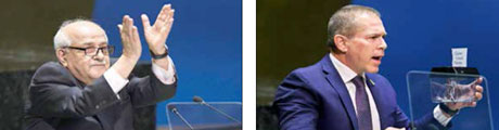 privilegiosa Palestina y pidió al Consejo de Seguridad reconsiderar su solicitud de ser miembro pleno. A la izquierda, el embajador palestino durante su discurso en la sesión; a la derecha, el israelí utilizó una trituradora portátil para destruir una copia de la Carta de Naciones Unidas.Foto Afp / Agencias