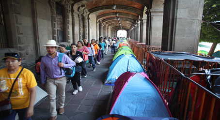 ▲ Integrantes del magisterio disidente mantienen su plantón en el Zócalo. Por la noche trascendió que la titular de Gobernación presionó a la coordinadora a permitir la instalación del templete para el cierre de campaña de la aspirante morenista, así como desplegar medidas de seguridad. A lo largo del día, los maestros impidieron descargar equipo para la concentración. Si hubiera una negativa se suspendería la mesa de diálogo para atender demandas. Foto María Luisa Severiano. Angélica Enciso y Bertha Ramírez