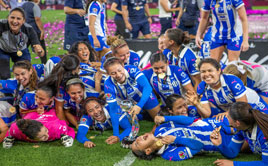 ◀ El cuadro regiomontano obtuvo la corona de la Liga Mx Femenil al derrotar 4-3 en tanda de penales (2-2 global) a las Águilas del América en la final del Clausura 2024, realizada en el estadio BBVA ante más de 31 mil aficionados. Foto Afp.