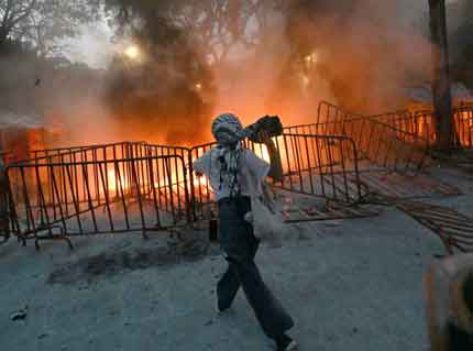 ▲ Alrededor de 200 integrantes de colectivos estudiantiles, quienes se manifestaban contra los bombardeos del gobierno de Benjamin Netanyahu en la ciudad palestina de Rafah, se enfrentaron con la policía capitalina en los alrededores de la representación diplomática. Los uniformados los replegaron con gases y extintores, mientras los activistas respondieron con piedras y bombas incendiarias. Foto Afp
