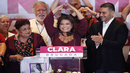 ▲ La candidata de Morena, PVEM y PT se convertirá en jefa de Gobierno de la Ciudad de México, de acuerdo con datos del conteo rápido, el cual le dio entre 49 y 52.8 por ciento de la votación. Acompañada por Ernestina Godoy y Omar García Harfuch se declaró triunfadora al cierre de las casillas con base en encuestas de salida. Su contrincante, el panista Santiago Taboada, reconoció su derrota tras cancelar un festejo en el Ángel de la Independencia. Foto Cristina Rodríguez. Rocío Alvarado y Alejandro Flores