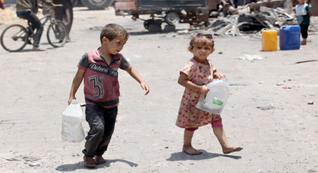 para conseguir el retorno de los rehenes. Después continuarán las conversaciones sobre cómo lograr eliminar a Hamas. En la imagen, niños en el campo de desplazados en Jabaliya consiguieron un poco de agua. Foto Afp. Agencias