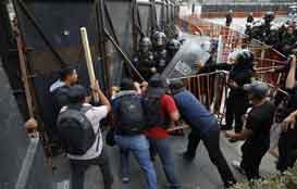 ◀ Integrantes de la CNTE se enfrentaron con policías que resguardaban Palacio Nacional, luego de conocerse que maestros fueron agredidos por colonos y transportistas durante su bloqueo al aeropuerto de Oaxaca; el reporte es de siete heridos. Foto Jorge P. García.