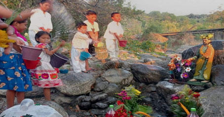 ▲ Vestidos con atuendos tradicionales, niños y niñas de la comunidad náhuatl de Cuapaxtitla colocaron una ofrenda en el río que cruza la localidad, el cual está prácticamente seco, para atraer la lluvia. Acompañados de sus padres, recrearon rituales de sus ancestros, que incluyen una imagen de San Isidro Labrador. El gobierno municipal de Huejutla, ubicada en la Huasteca Hidalguense, informó que ante el bajo nivel de las principales fuentes de abastecimiento de agua solicitó una declaratoria de emergencia. Foto La Jornada. R. Montoya