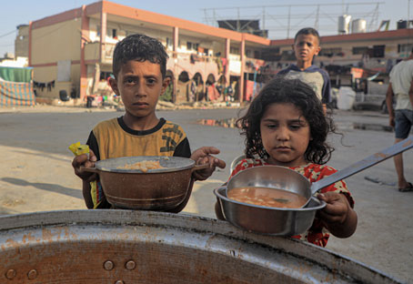 pausa tácticadeclarada ayer por el ejército israelí sobre una ruta del sur de Gaza para impulsar la llegada de ayuda humanitaria y prometió una investigación. La medida fue tomada después de conversaciones con la ONU y organizaciones internacionales, informaron fuentes militares. Las protestas contra la gestión del mandatario continuaron con bloqueos en carreteras. En la imagen, dos niños palestinos reciben alimentos en la ciudad de Jan Yunis. Foto Xinhua. Agencias